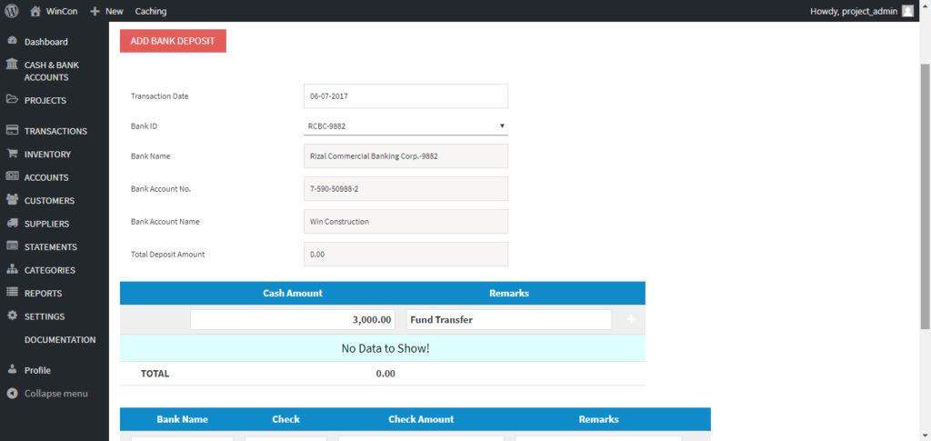 All checks for deposit must have been encoded as “Check Received” before in can posted as “Deposit” in the system. The checks received can be posted in the system via the Transactions > Sales menu or via Cash and Bank Accounts > Checks Received.