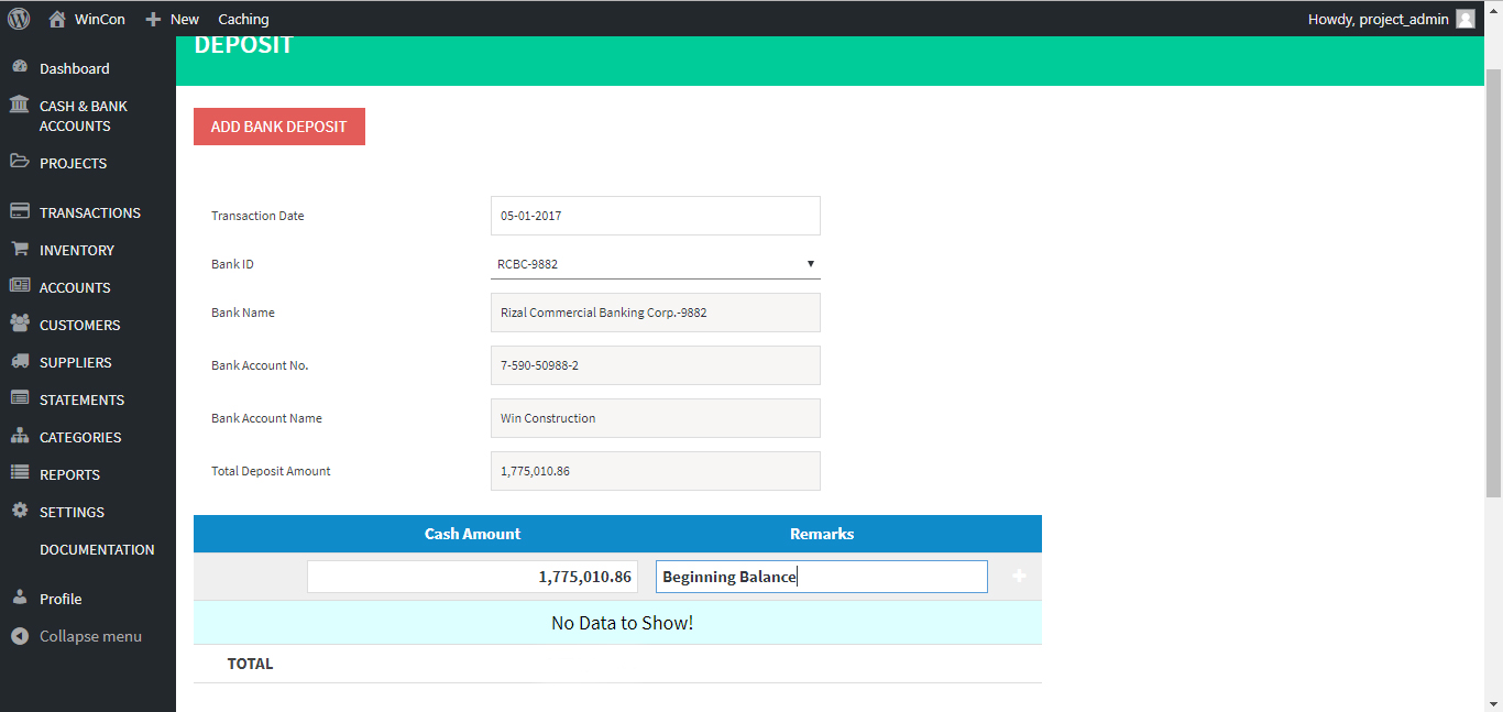 - Enter the amount setup as beginning balance in the Cash section of the deposit menu.