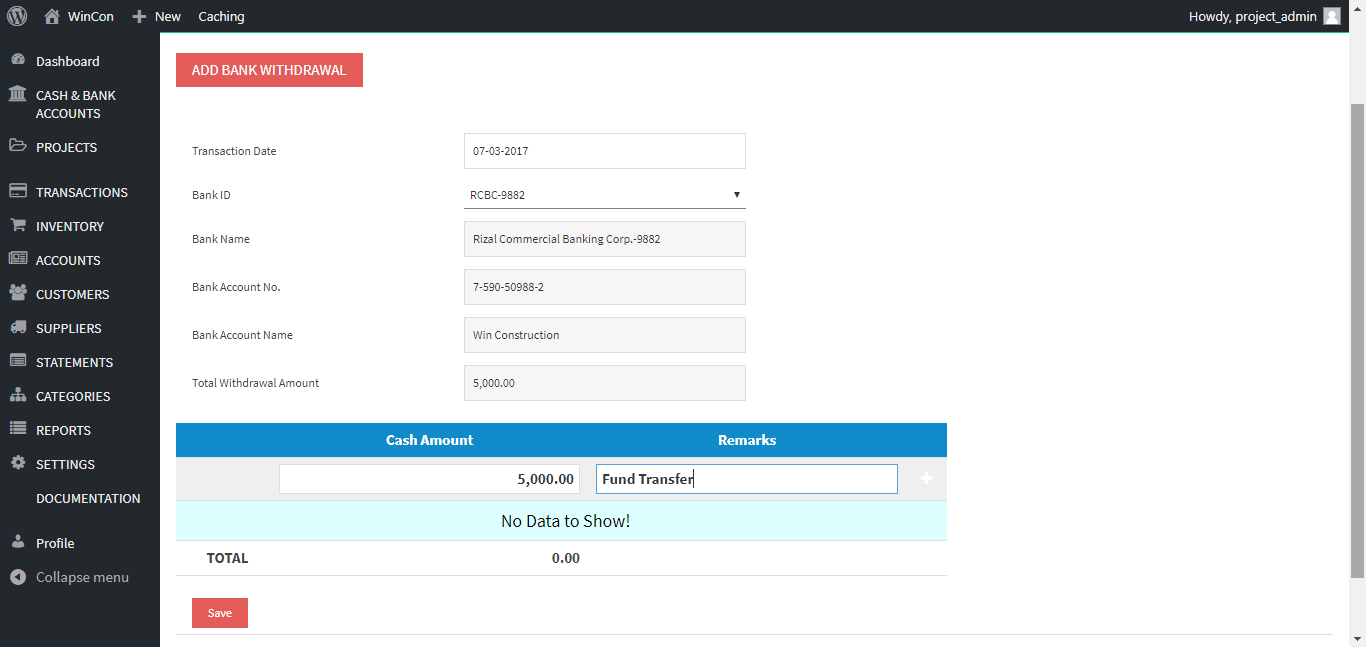 - If it is a withdrawal/debit, use the “Withdrawal” menu enter the amount in the Cash Amount section. Then enter “Fund Transfer” as Remarks.